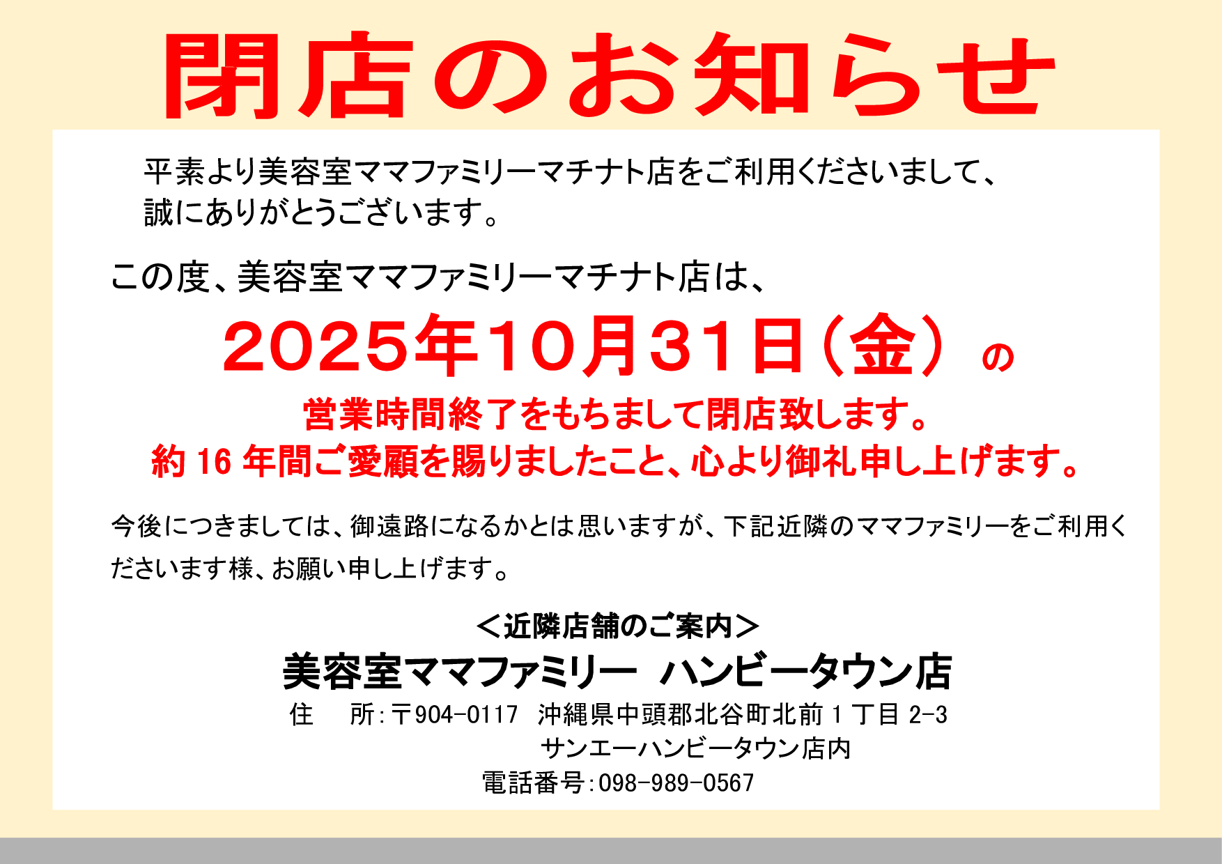 この度、美容室ママファミリーマチナト店は閉店することになりました。